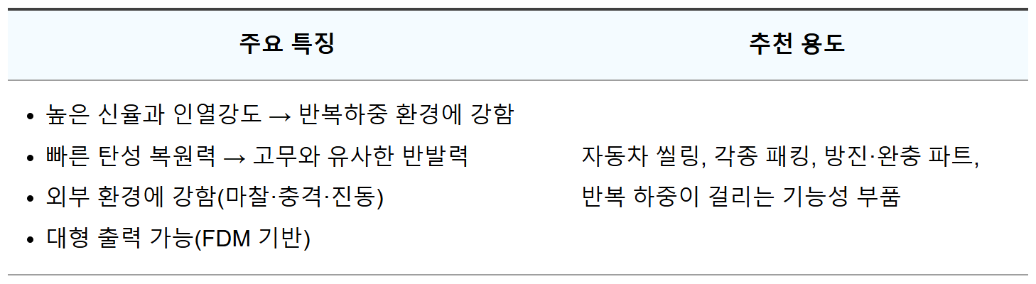 하중이나 반복 움직임이 요구되는 기능성 연질 파트를 3D 프린팅할 때 적합한 소재입니다.