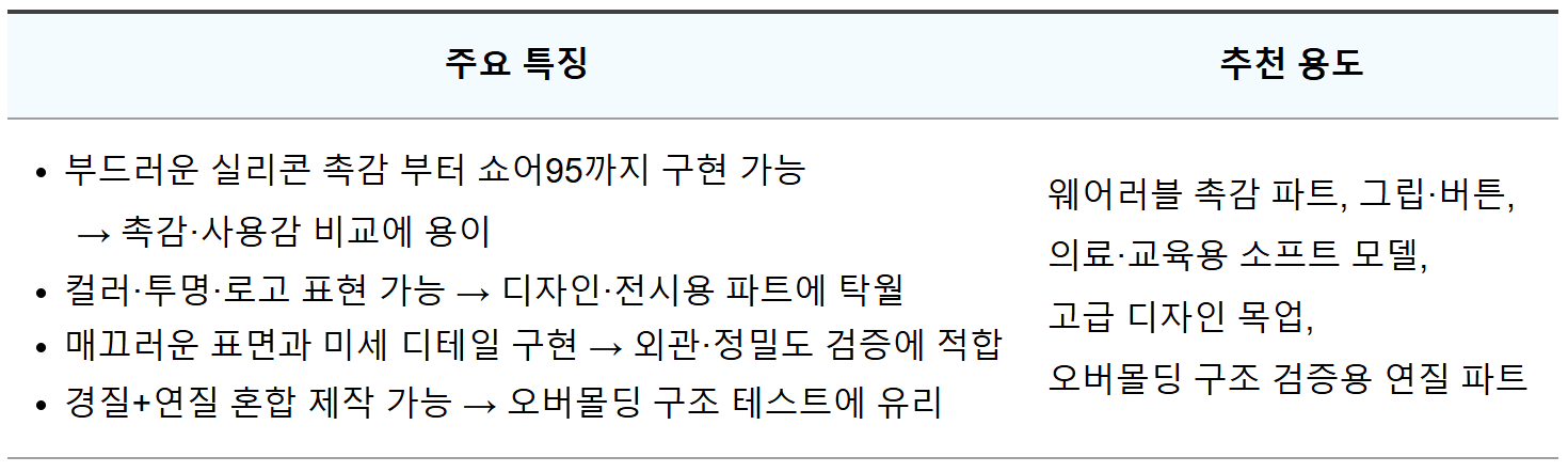 촉감·외관·디자인 검증이 필요한 연질 파트를 제작할 때 가장 적합한 소재입니다.