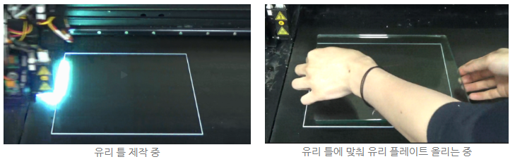 유리 틀 프린팅이 완성된 후, 그 위에 유리 플레이트를 올리고 본격적으로 3D 프린팅을 시작했습니다.