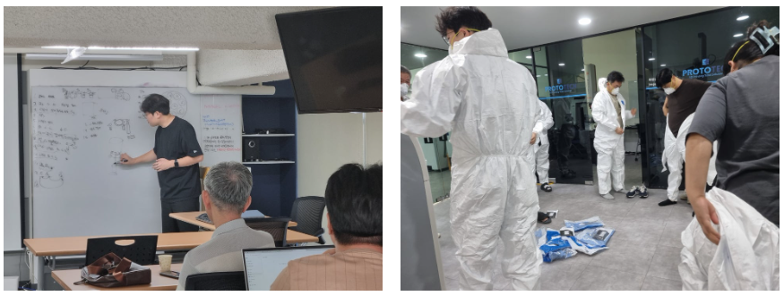 장비 실습에 앞서 공정 진행 방식에 대한 설명을 다시 한 번 듣고, 안전복과 분진 마스크를 착용한 뒤 실습에 참여했습니다.