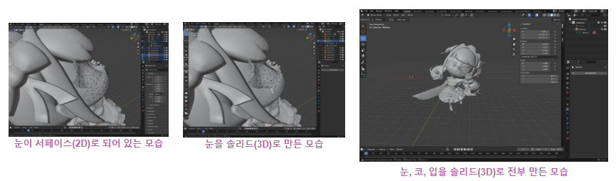 Blender의 Edit Mode에서 메시 구조를 확인하며 세부 형상을 점검하고 부족한 부분을 보강했습니다. 특히 원본 모델의 눈·코·입은 단순 텍스처(2D)로 처리되어 있었기 때문에, 이를 실제 입체감을 살릴 수 있도록 솔리드 구조로 변환했습니다. |
