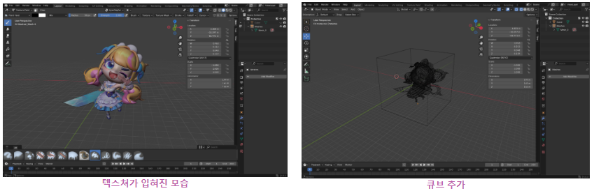 Blender에서 UV 텍스처를 적용해 캐릭터 고유의 색감을 그대로 살렸습니다. 또한 3D 프린팅 후 안정적으로 세워둘 수 있도록 캐릭터를 투명 큐브로 감싸주었습니다.