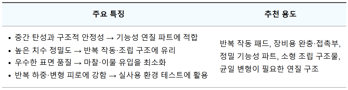 하중이나 반복 움직임이 요구되는 기능성 연질 파트를 3D 프린팅할 때 적합한 소재입니다.